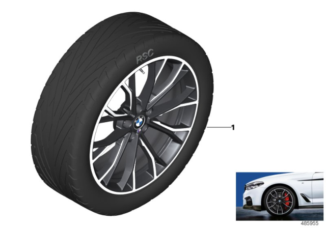 In the EU Member States and in Switzerland the extract from the EU type approval (stored for the wheel/ tyre combinations on the EF Home page or KSD DVD, in Germany also on the Infonet under BMW > Aftersales > Zubehoer > Gutachten) must be issued to the customer. This must be kept in the vehicle. An additional change to the vehicle documents may be required on a country-specific basis. Runflat tyres with emergency running properties Mixed tyres Front axle 245/35R20 95Y Rear axle 275/30R20 97Y Goodyear Eagle F1 Asymmetric 3 ROF Disc wheel, black, burnish-turned